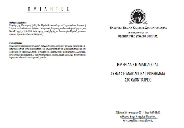 Ο Οδοντιατρικος Συλλογος Βοιωτιας διοργανώνει σε συνεργασία με την Ελληνική Εταιρεία Κλινικής Στοματολογίας ημερίδα με θέμα "Συχνά στοματολογικά προβληματα στο Οδοντιατρείο".